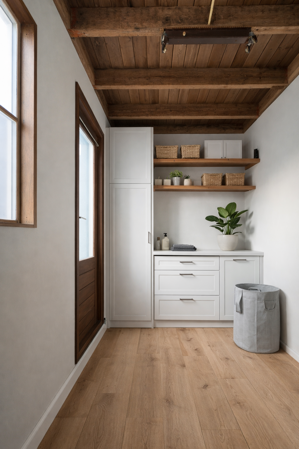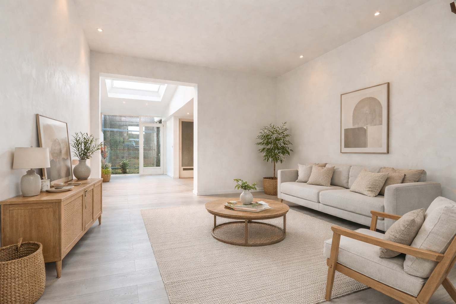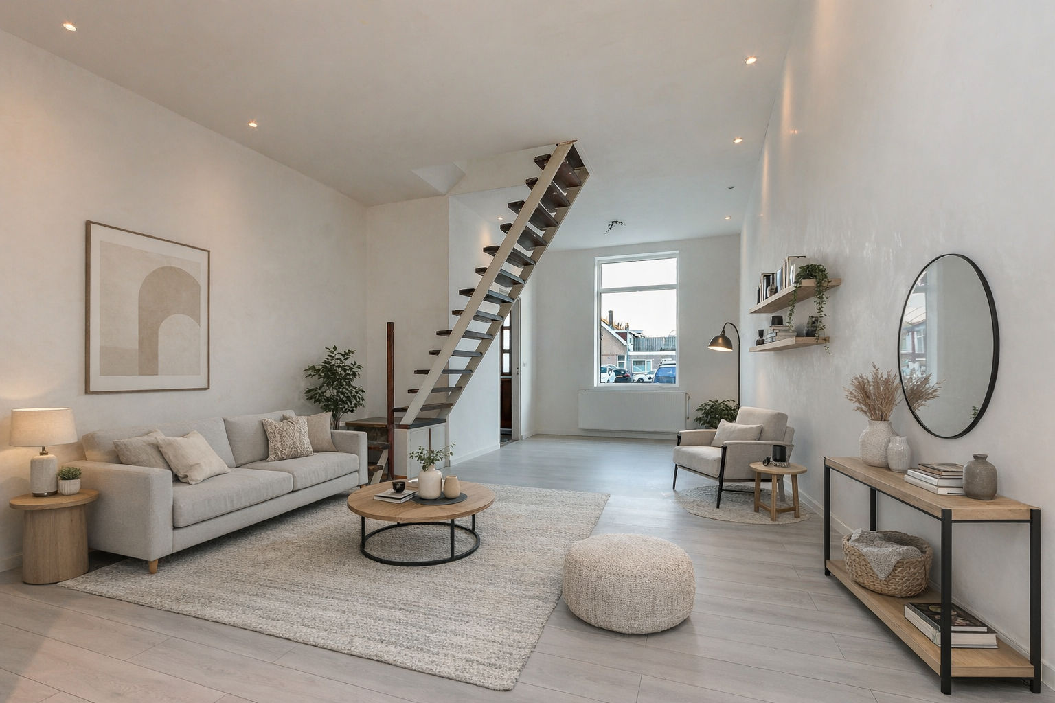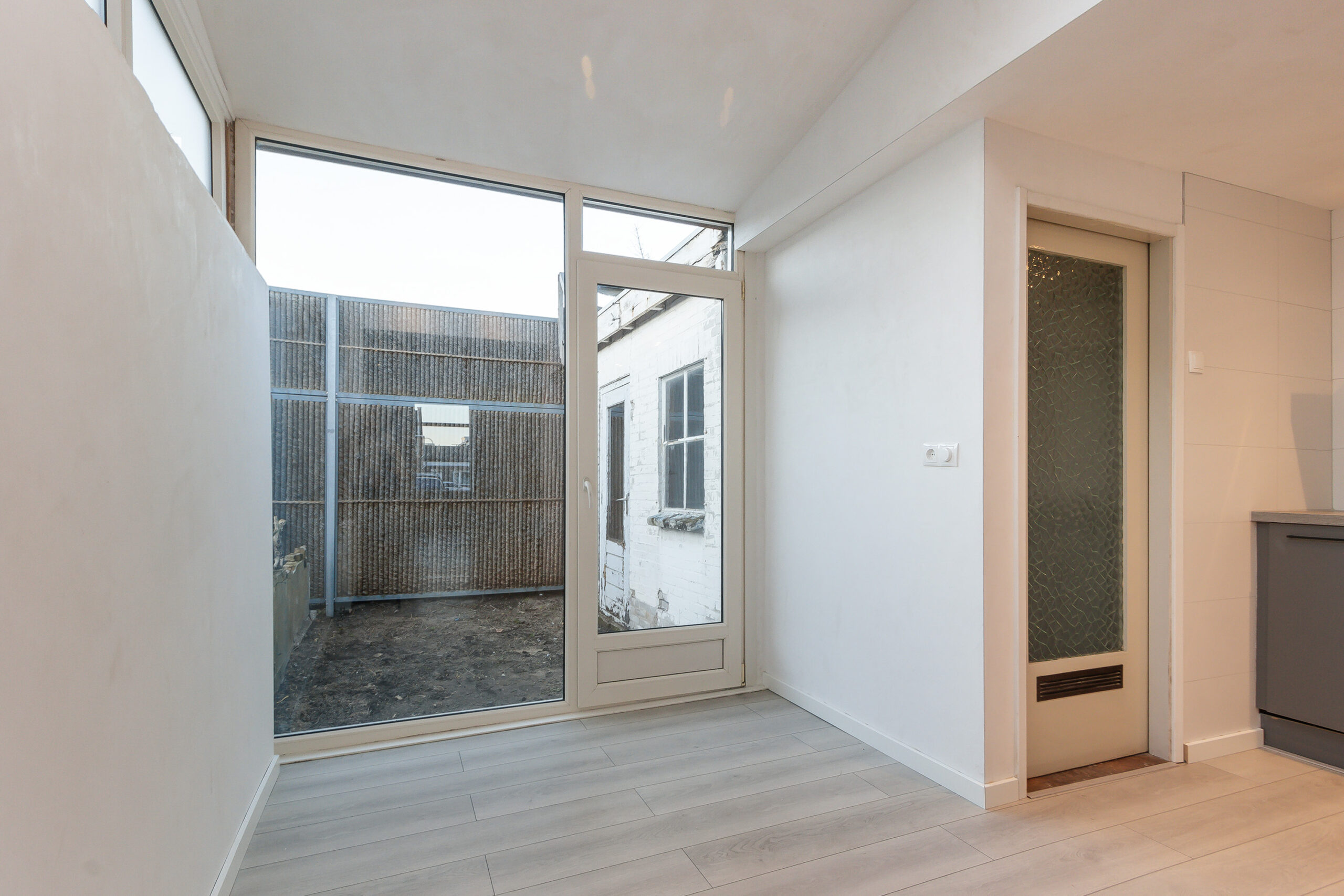 Door de uitbouw aan de achterzijde is een ruime en open leefruimte ontstaan. De begane grond is strak afgewerkt en voorzien van een lichte laminaatvloer, glad gestuukte wanden en inbouwspotjes. In de uitbouw bevinden zich de moderne keuken en een toilet. Ook is er een praktische berging aanwezig, die met een kleine aanpassing geschikt is als bijkeuken of werkruimte. Via de berging en woonkamer is er toegang tot de tuin, die nog volledig naar eigen wens kan worden ingericht.