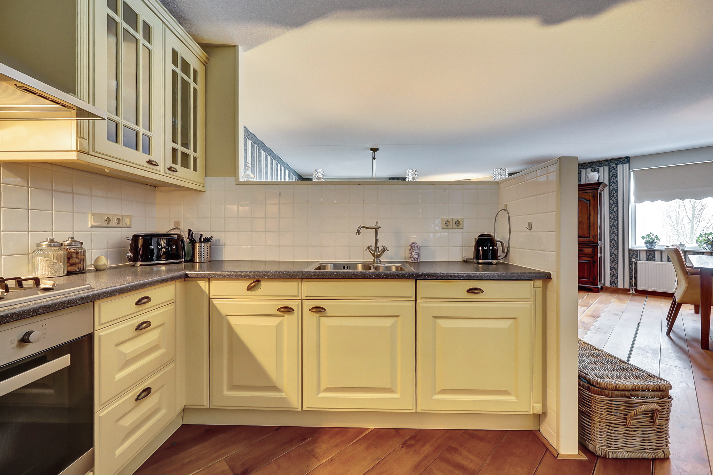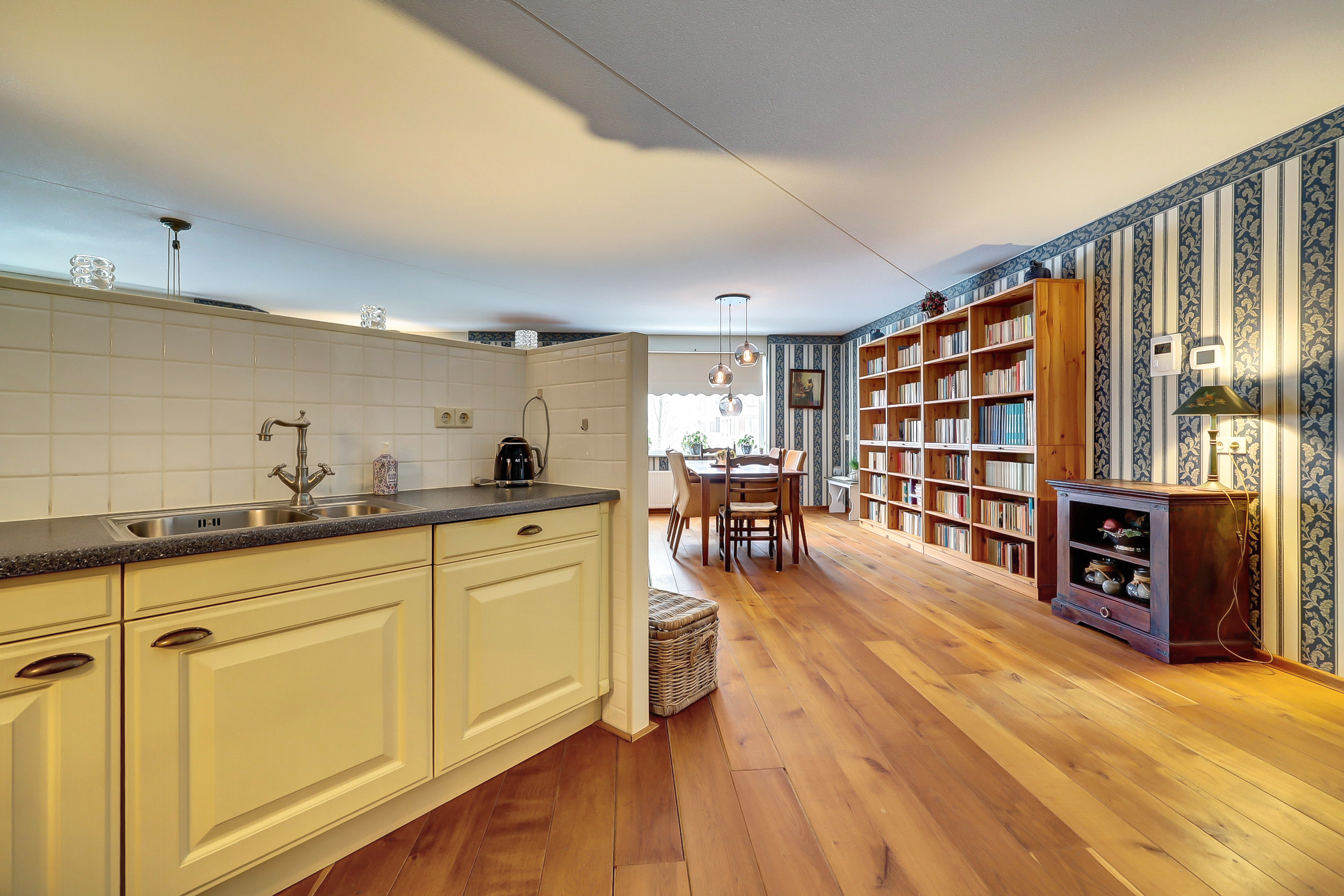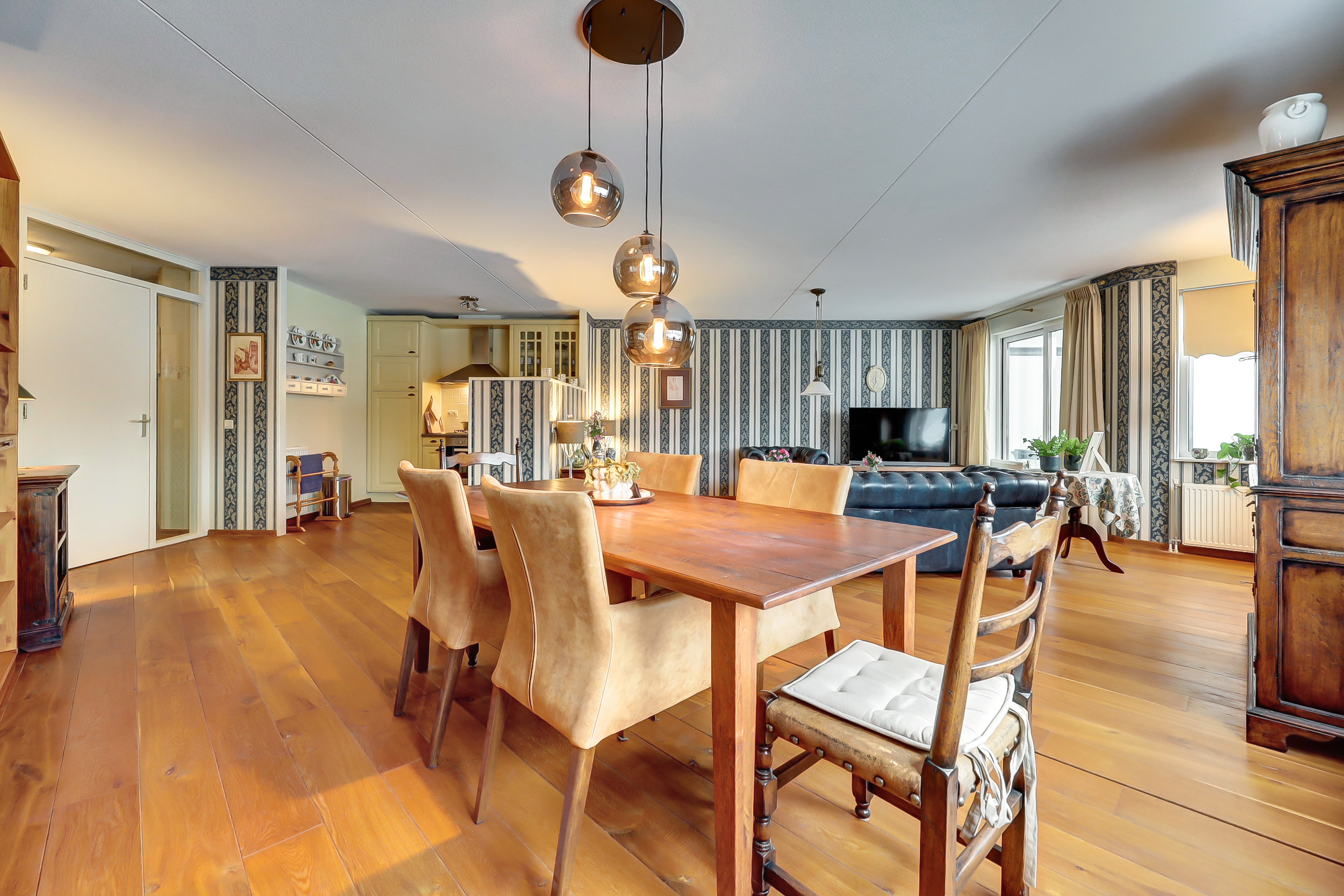 De woon- en eetkamer is ruim opgezet en heeft een speelse indeling, met vrij uitzicht en meerdere mogelijkheden om de ruimte op je eigen manier in te richten. De keuken sluit logisch aan op de leefruimte.